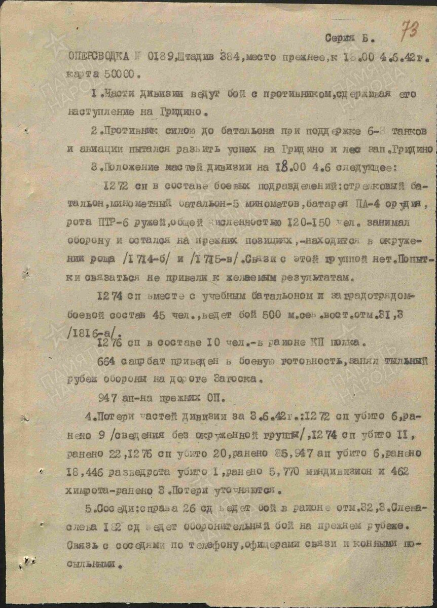 За 4-е июня потери дивизии составили: 1272-м полку — 9 убитых и 15 раненых, 1274-м — 15 убитых и 41 раненый, а по 1276-м полку данных нет. Но ему досталось больше всех. В полках дивизии оставалось: в 1272-м — 120-150 «штыков», в 1274-м — 45, в 1276-м — 10 .